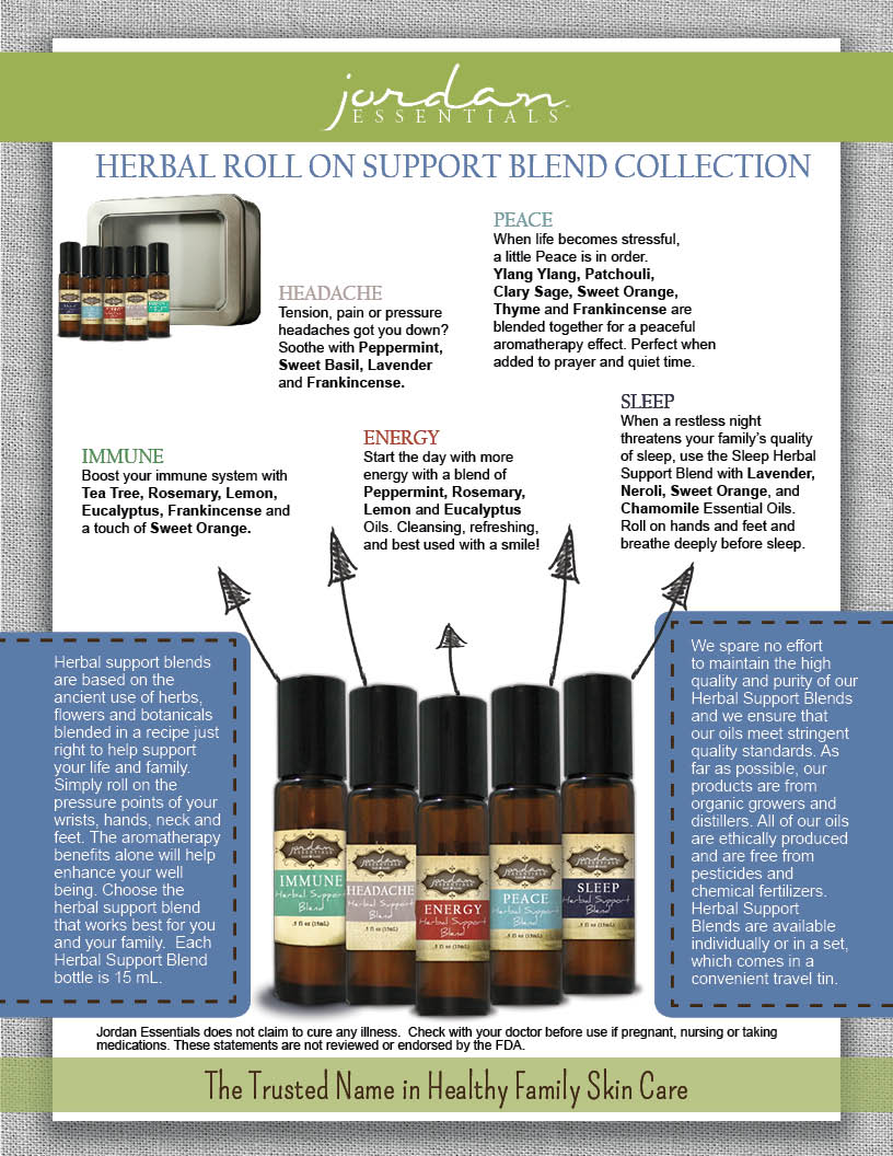 Ah the holiday season.  take a deep breath and focus on the positives and add some herbal support blends to your holidays. Peace: When life becomes stressful, a little Peace is in order. Ylang Ylang, Patchouli, Frankincense, Clary Sage, Sweet Orange, and Thyme are blended together for a peaceful aromatherapy effect. Perfect when added to prayer and quiet time. Key ingredients include Frankincense, Patchouli, and Ylang-Ylang Oils. Headache: Got a headache from Aunt Edna and her perfume or maybe the weather change or weary from traveling?   Soothe wtih Peppermint, Sweet Basil, Lavender, and Frankincense. Key ingredients include Lavender, Peppermint, Sweet Basil, and Frankincense Oils. Immune:  Boost your Immune system with Tea Tree, Rosemary, Lemon, Eucalyptus, Frankincense, and a touch of Sweet Orange. Key ingredients include Frankincense, Tea Tree, Rosemary, Lemon, Eucalyptus, and Sweet Orange Oils.  Sleep: When a restless night threatens your family’s quality of sleep and there are no sugar plumb fairies dancing in their heads, use the Herbal Support Blend Sleep with Lavender, Neroli, Sweet Orange, and Chamomile Essential Oils. Apply to hands and feet and breathe deeply before sleep. Key ingredients include Lavender, Neroli, Chamomile, and Sweet Orange Oils. Energy: Start the day cooking, shopping or family time with more energy and even skip your afternoon coffee. Peppermint, Rosemary, Lemon, and Eucalyptus Oils blended together. Cleansing, refreshing, and best used with a smile! Key ingredients include Peppermint, Rosemary, Lemon, and Eucalyptus Oils. Jordan Essentials does not claim to cure any illness. Check with your doctor first if pregnant, nursing, or taking medication. Not endorsed by the FDA.